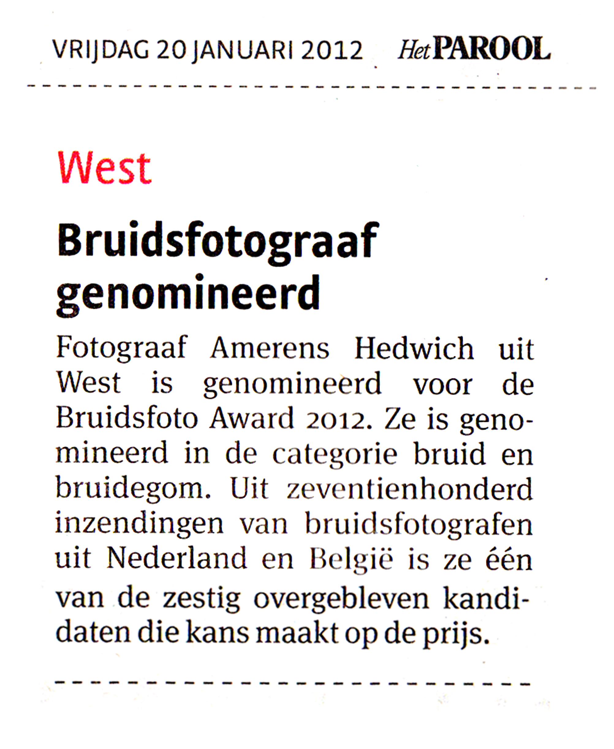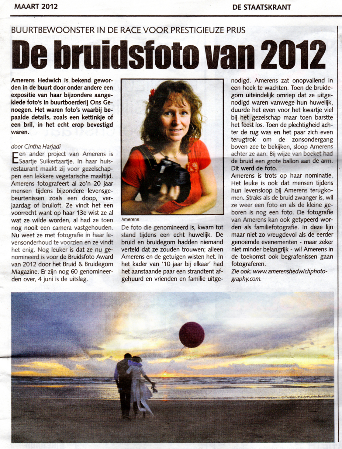 Dinsdag 7 februari 2012 om 17.15u-17.35u is Amerens Hedwich in gesprek geweest bij RTV-NH in het programma Noord-Hollands Diep, over bruidsfotografie en de genomineerde foto. Dit programma is te zien via http://www.rtvnh.nl/uitzending-gemist/tv/225/36073/Noord-Hollands+Diep